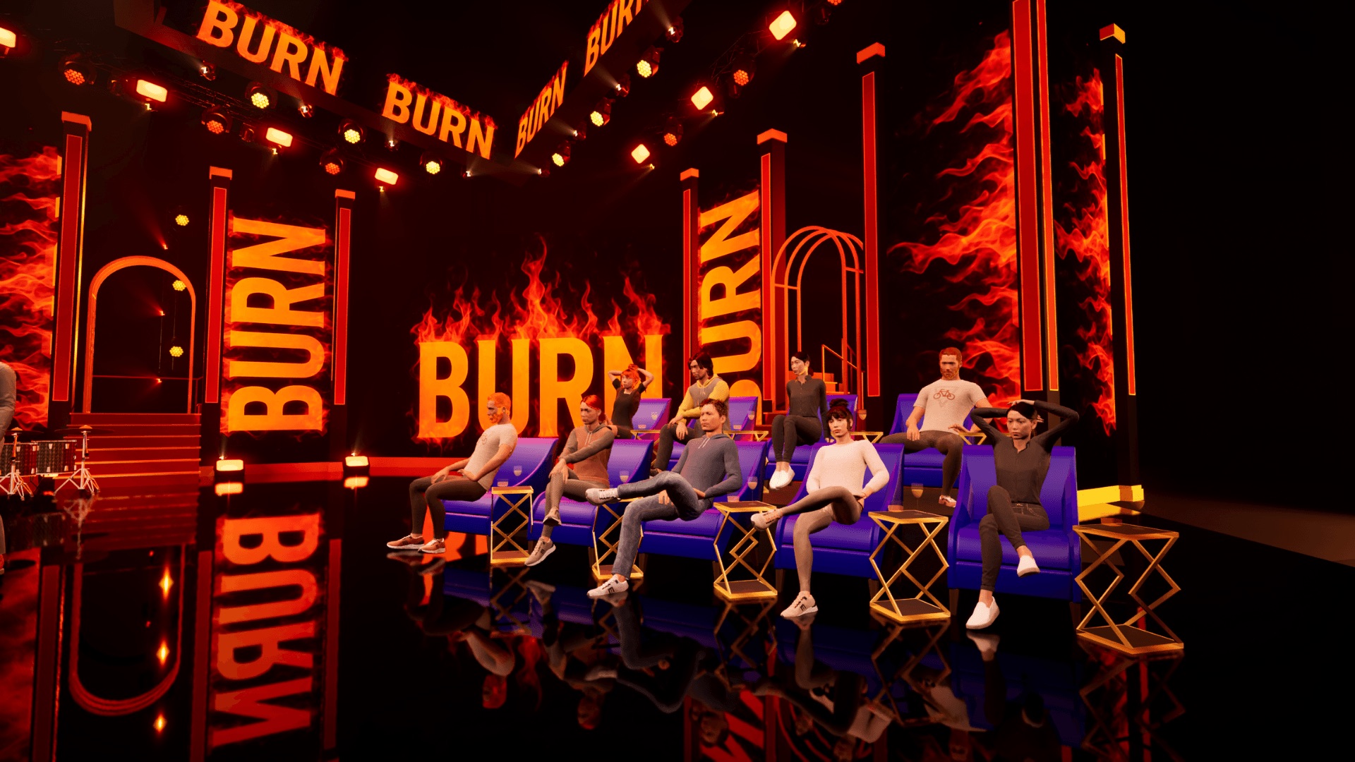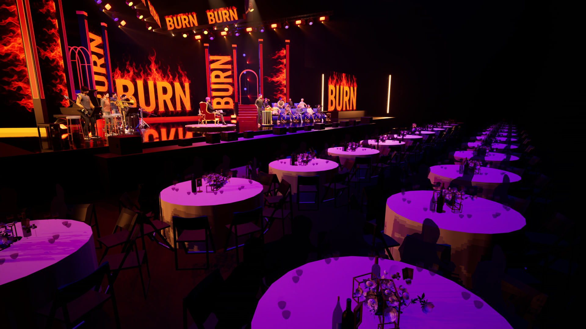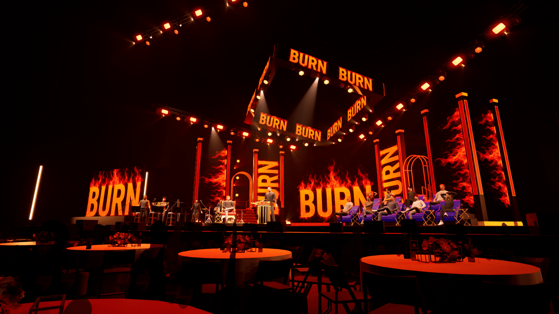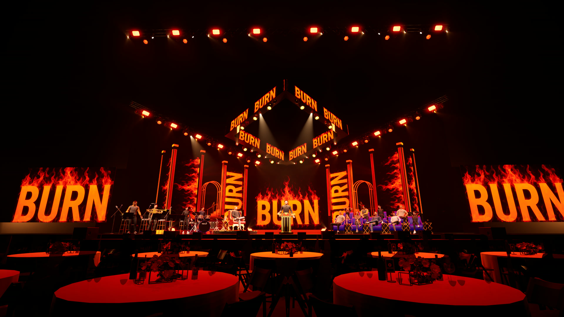 Final previsualization built in Unreal Engine 5 with the complete “BURN” stage branding and fire graphics.