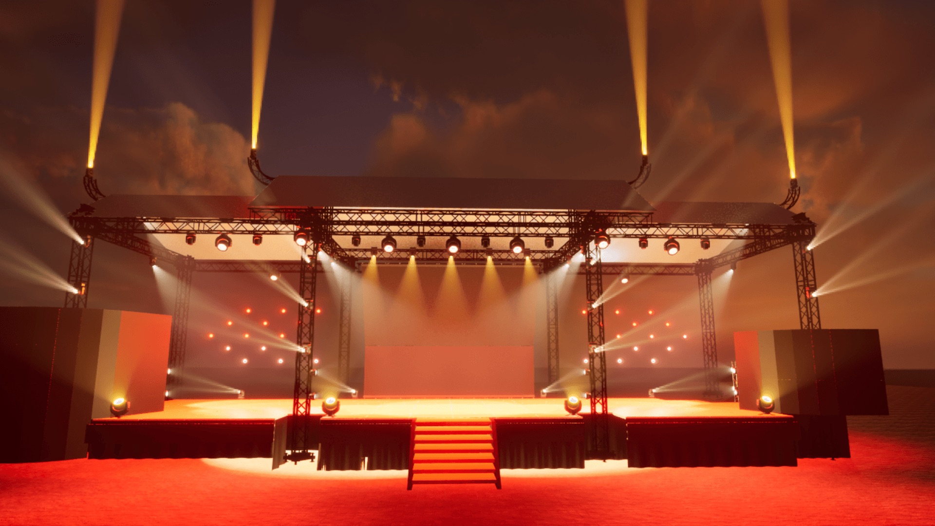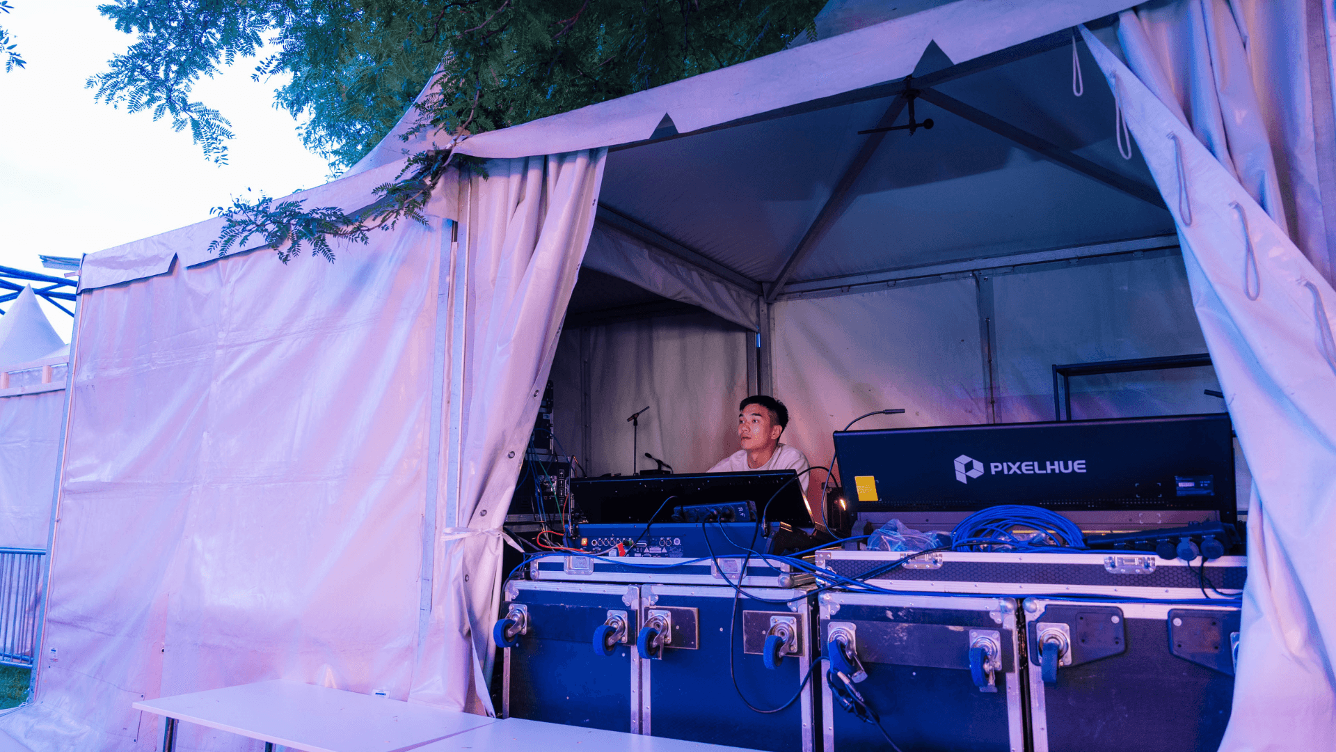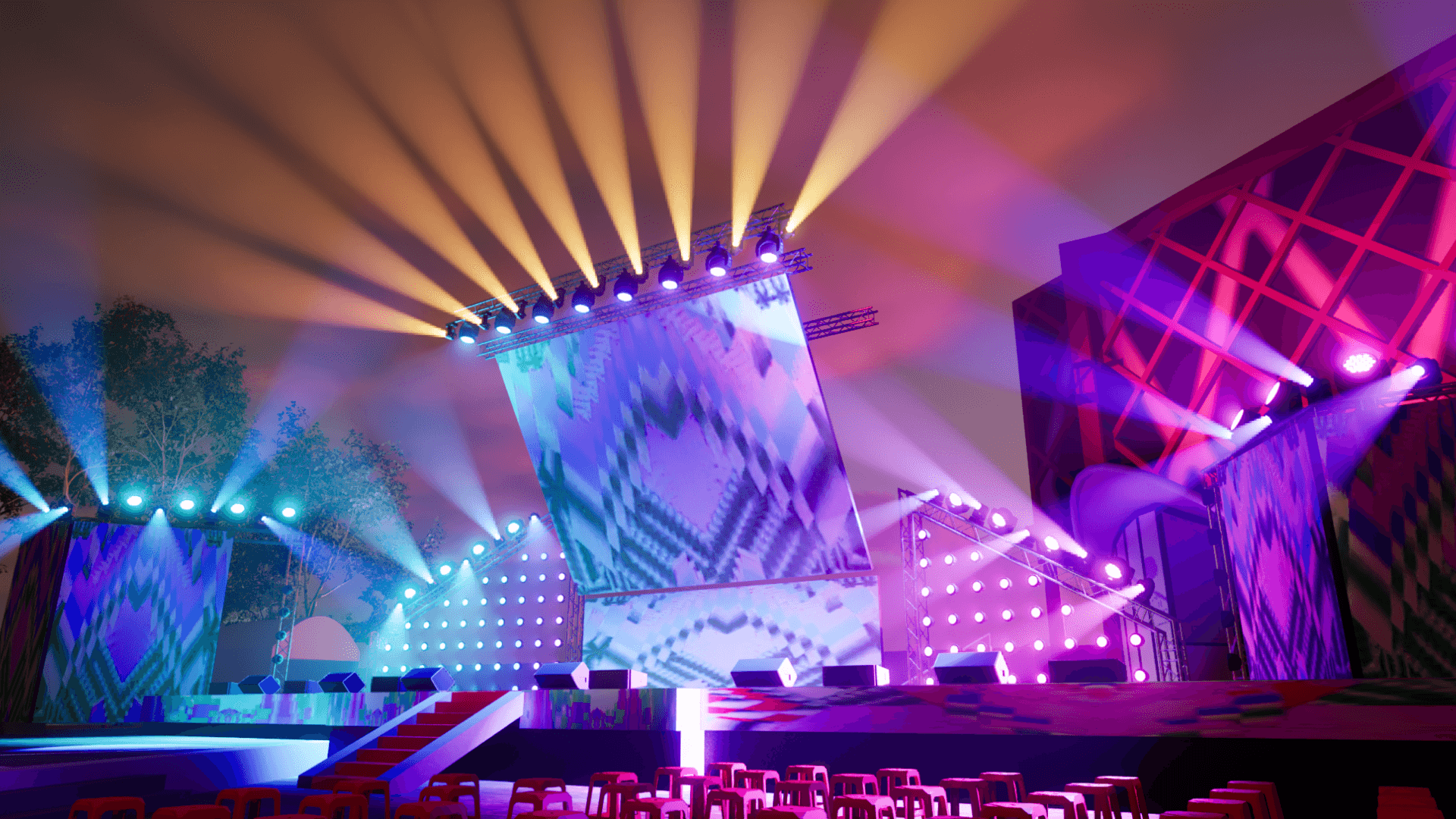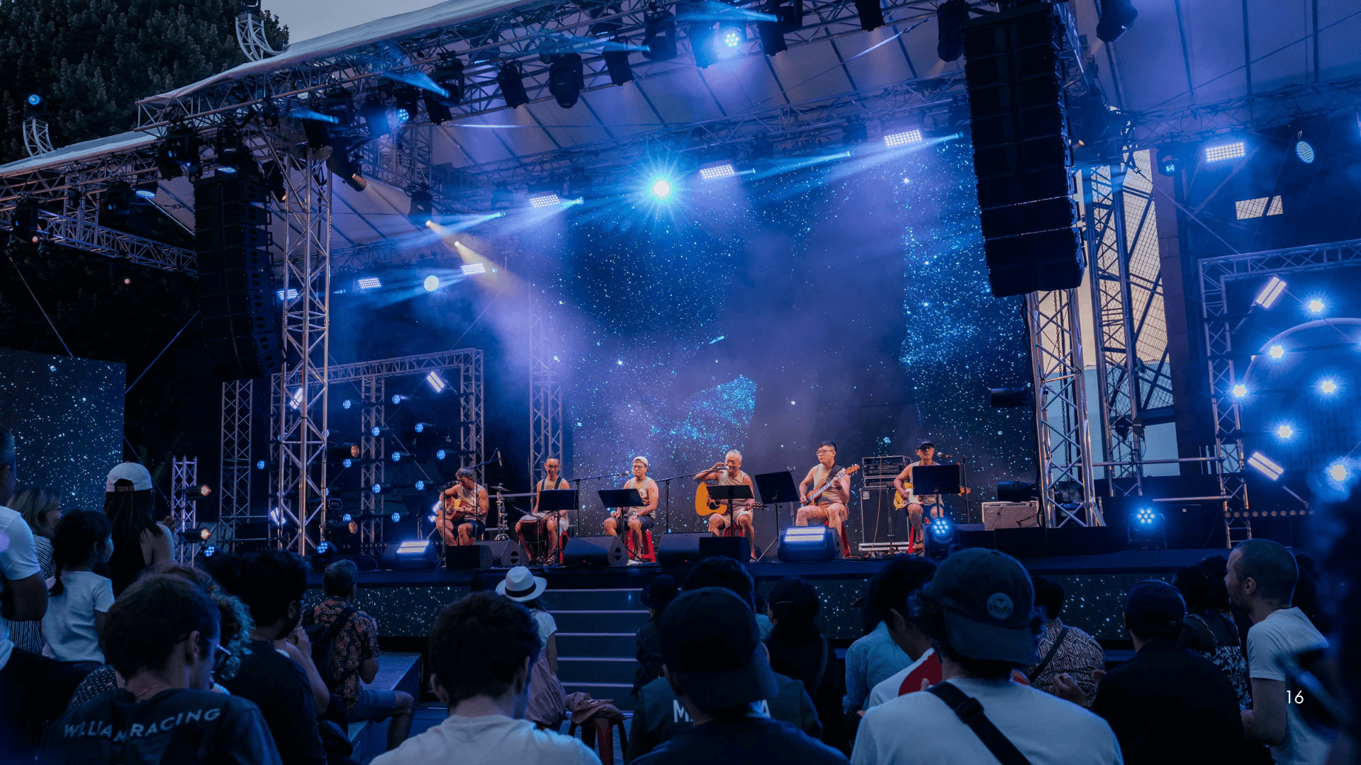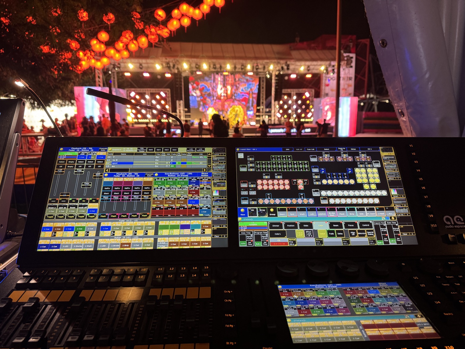 The outdoor park venue and budget constraints made it difficult to add extensive rigging structures. In particular, no rigging points were available in the FOH (front-of-house) area, limiting traditional front lighting options.