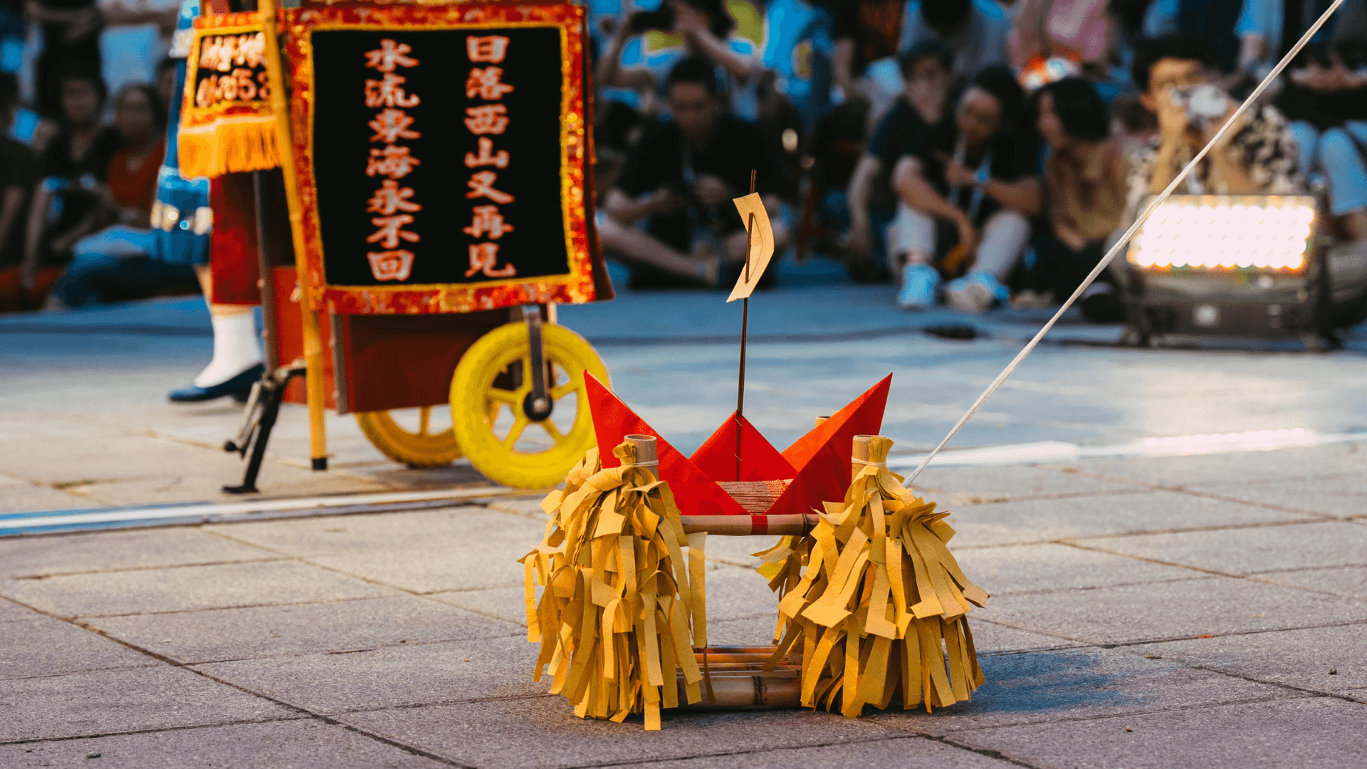 I chose a soft structure solution — suspending red lanterns fitted with LED lights as house lights, all controlled via grandMA2 Light. Traditional front lighting was replaced with side light and high side light angles. This not only solved the rigging limitation but also brought the authentic essence of Taiwan to Paris — the red lanterns becoming both a functional lighting element and a cultural symbol.