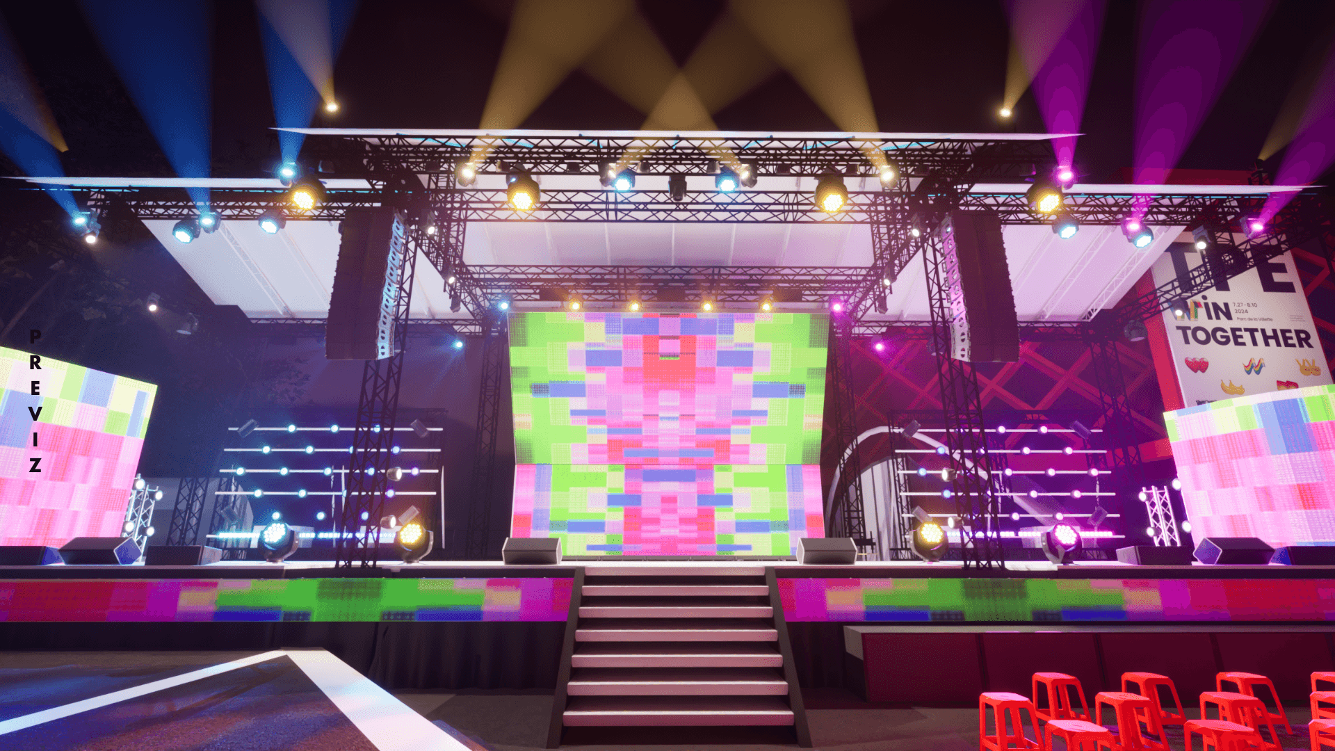 Previsualization built in Unreal Engine 5, utilizing the DMX component connected with grandMA2 onPC for real-time lighting control. Used for technical pre-programming, cross-team communication with French technicians, and as official media assets prior to the event.