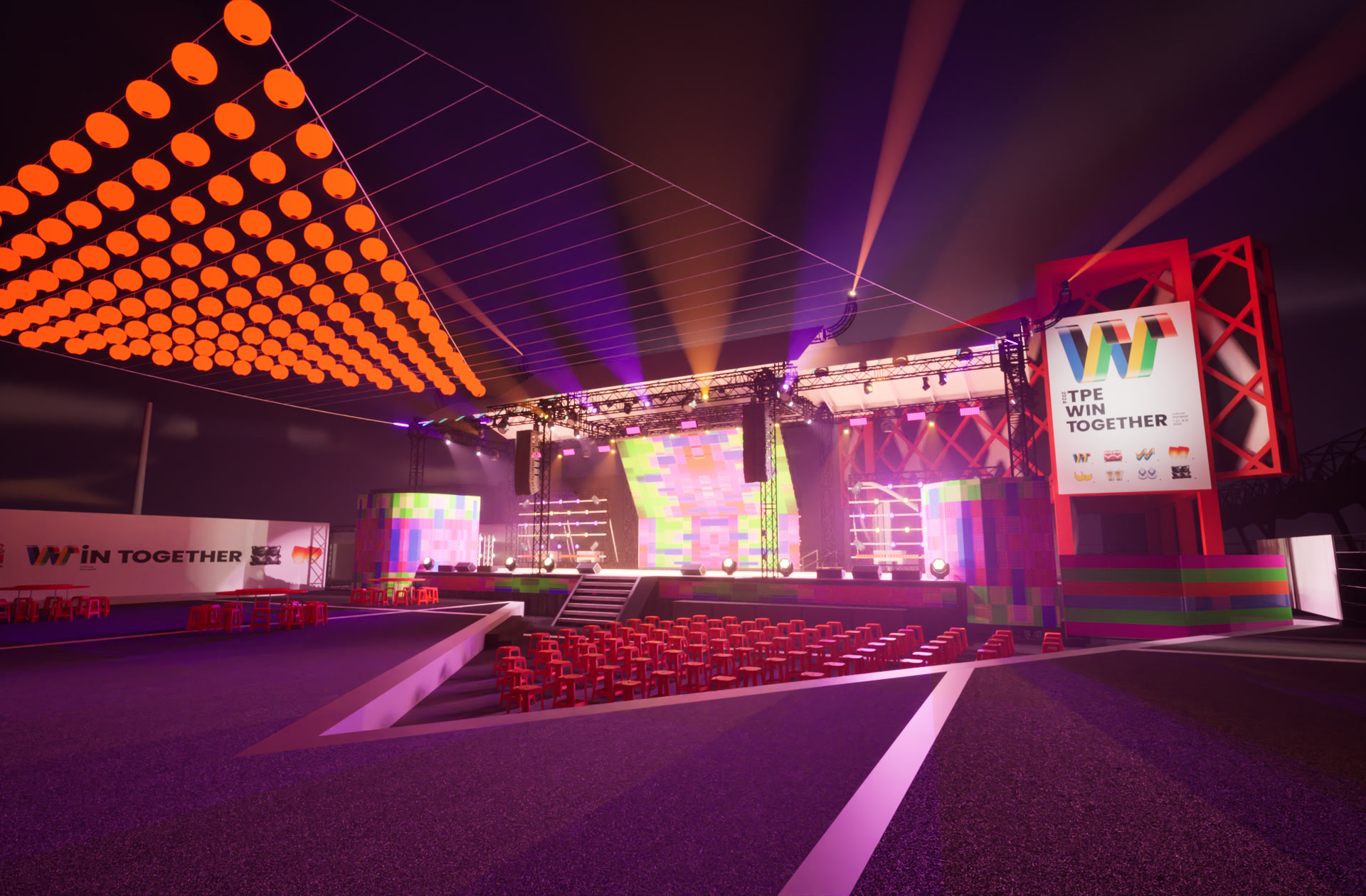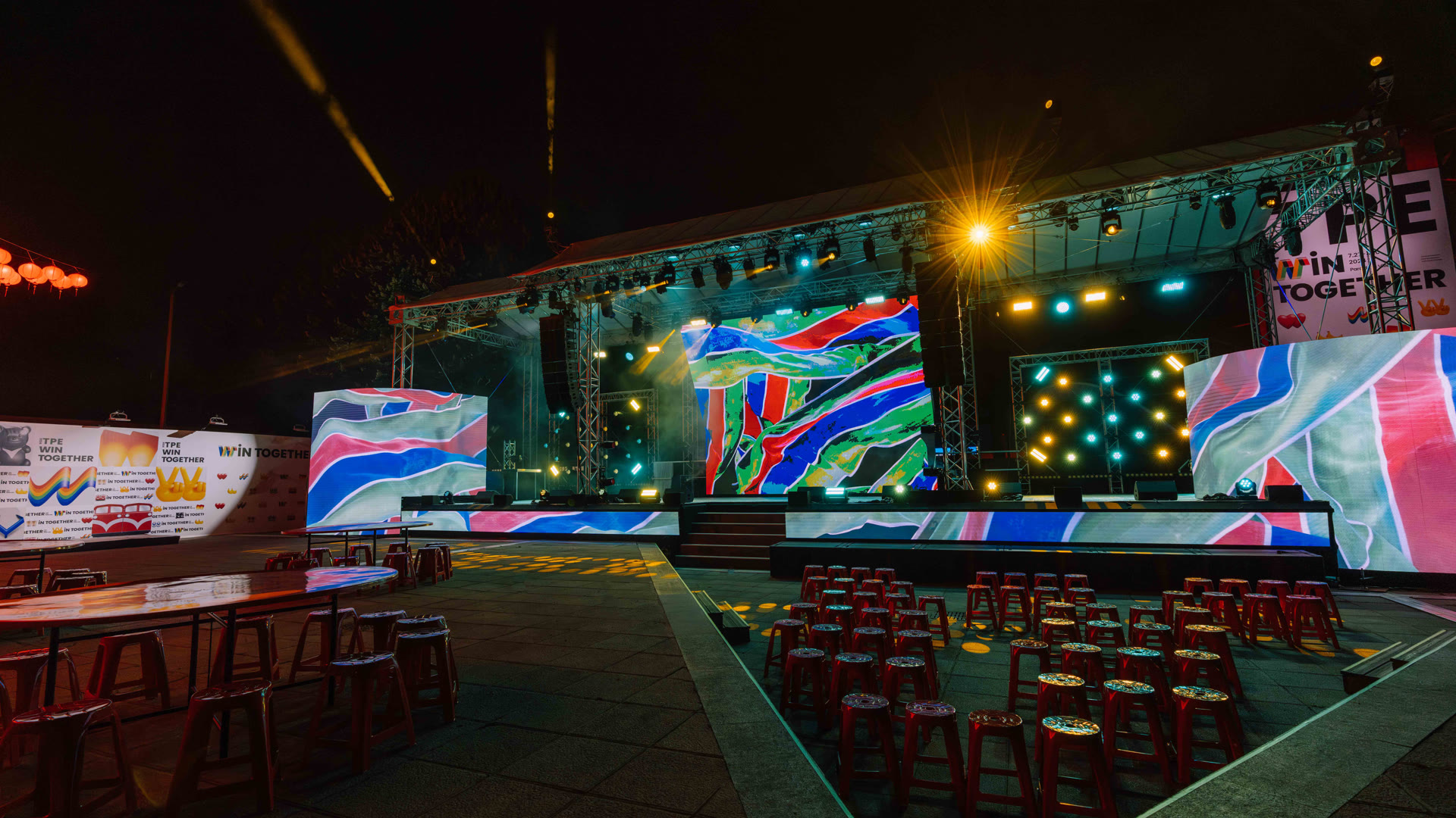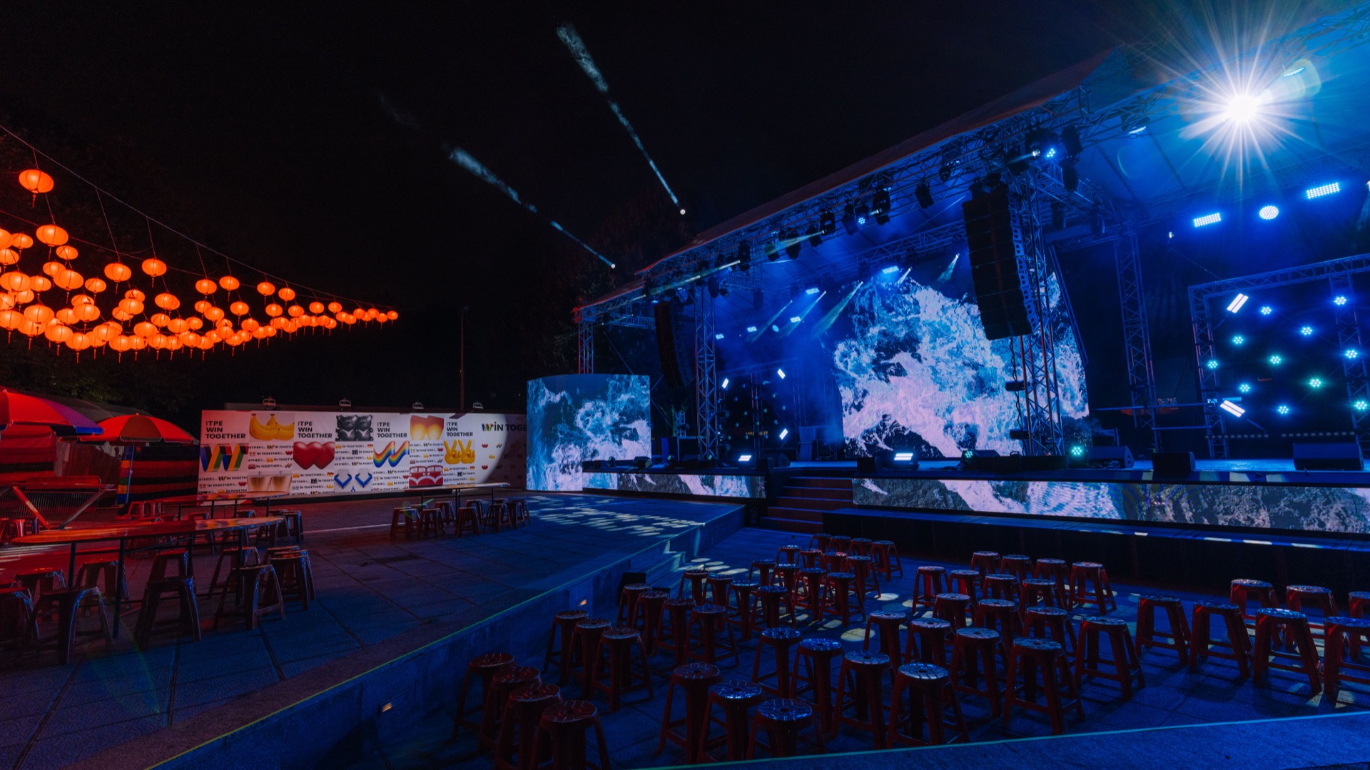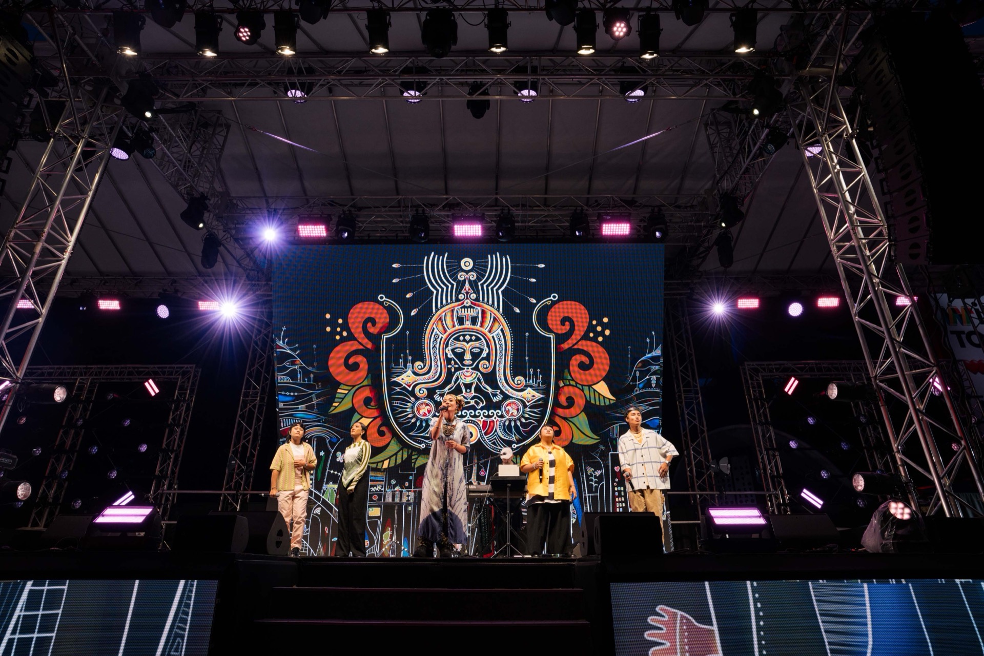 The stage design drew inspiration from Taiwan’s iconic “Transformer” electronic flower trucks — a vivid symbol of temple festivals and street celebrations. The structure features four upward-pointing corners evoking traditional Taiwanese temple architecture, with beam fixtures mounted at the peaks to extend the form skyward.