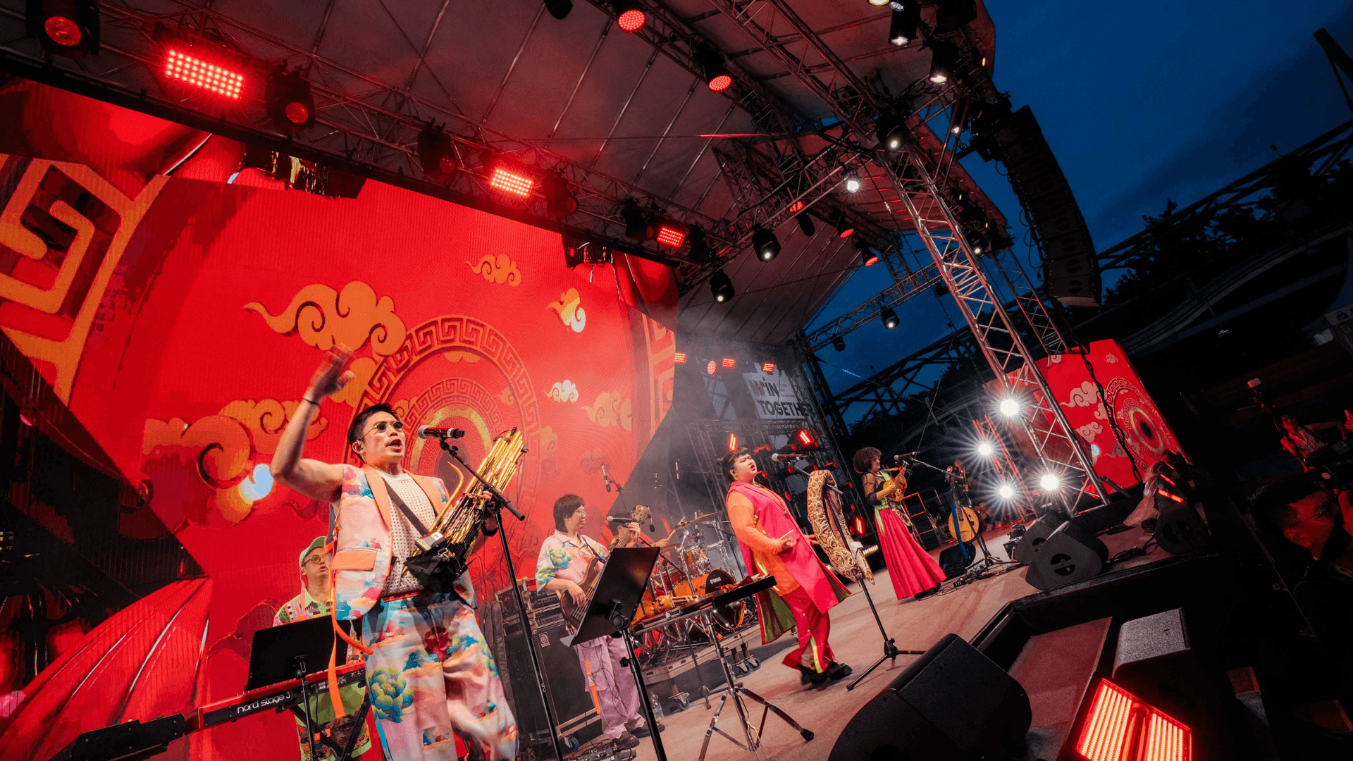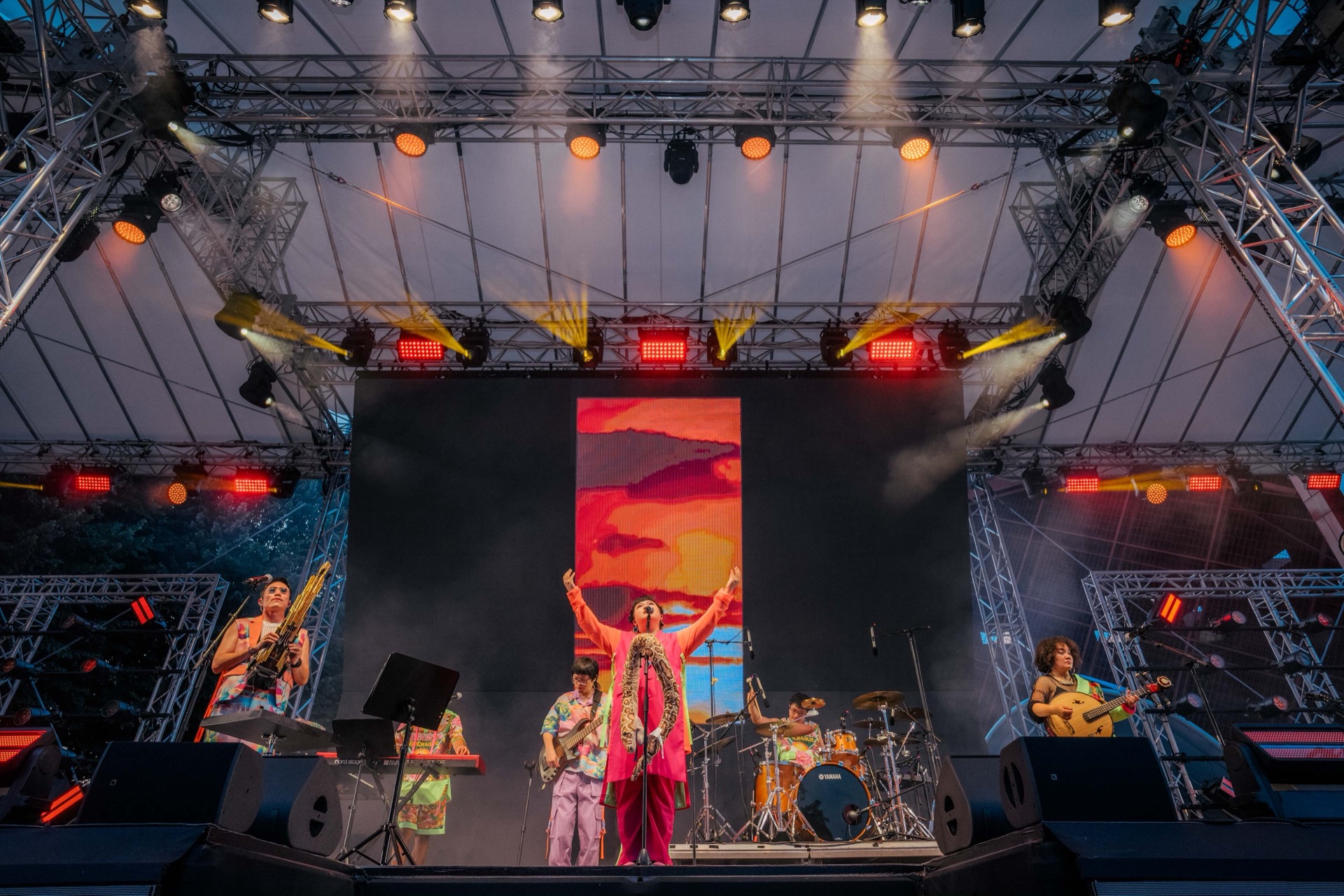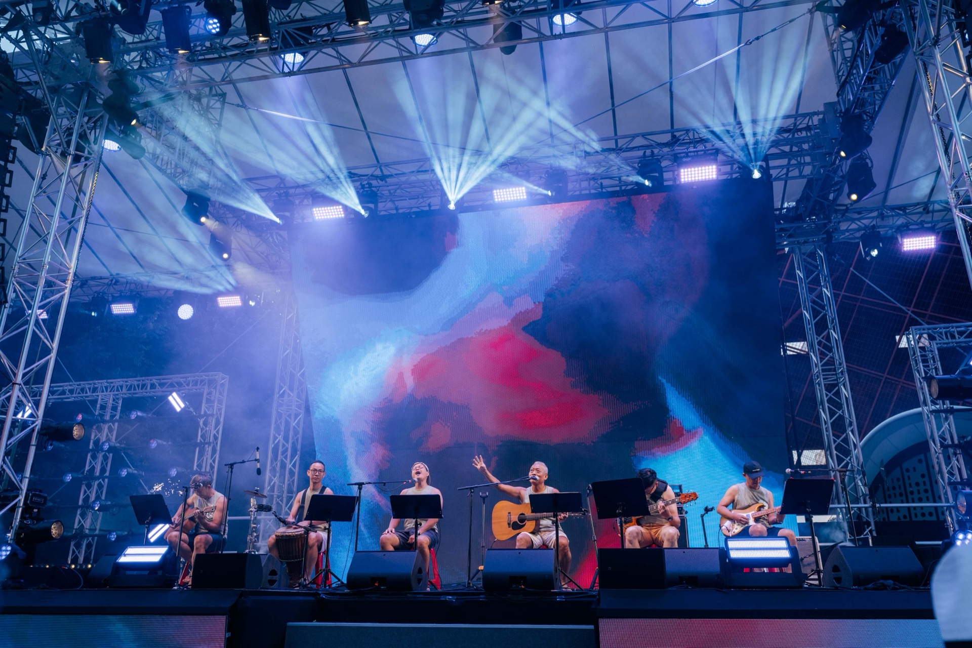 Daytime — The two LED matrix walls flanking the stage (42 × LED PAR COB200) served as the primary visual expression, breathing and flowing in rhythm with the music performances.